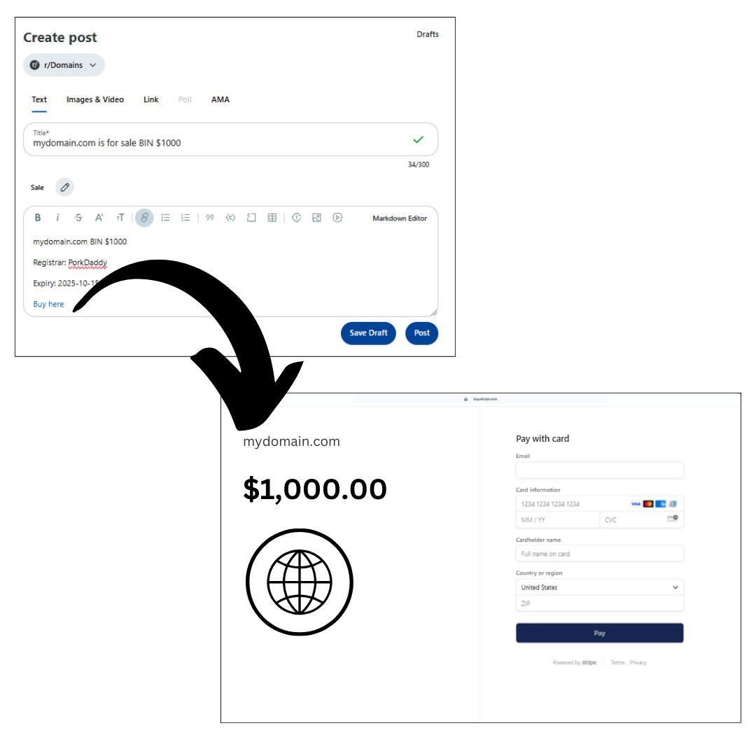 Once the domain is transferred, the funds are instantly released to the seller, leveraging Stripe’s secure payment technology and identity verification.